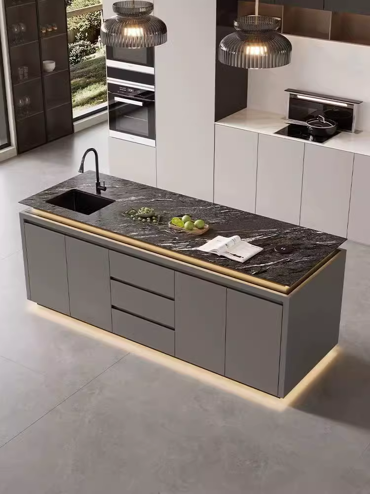 轻奢岛台家用厨房木纹带灯大理石料理台水吧台隔断中岛台吧台定制
