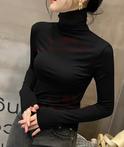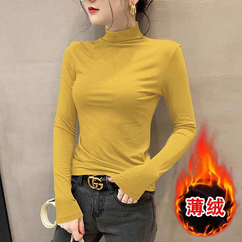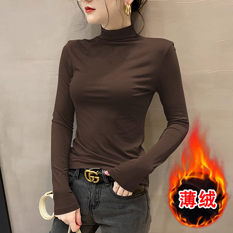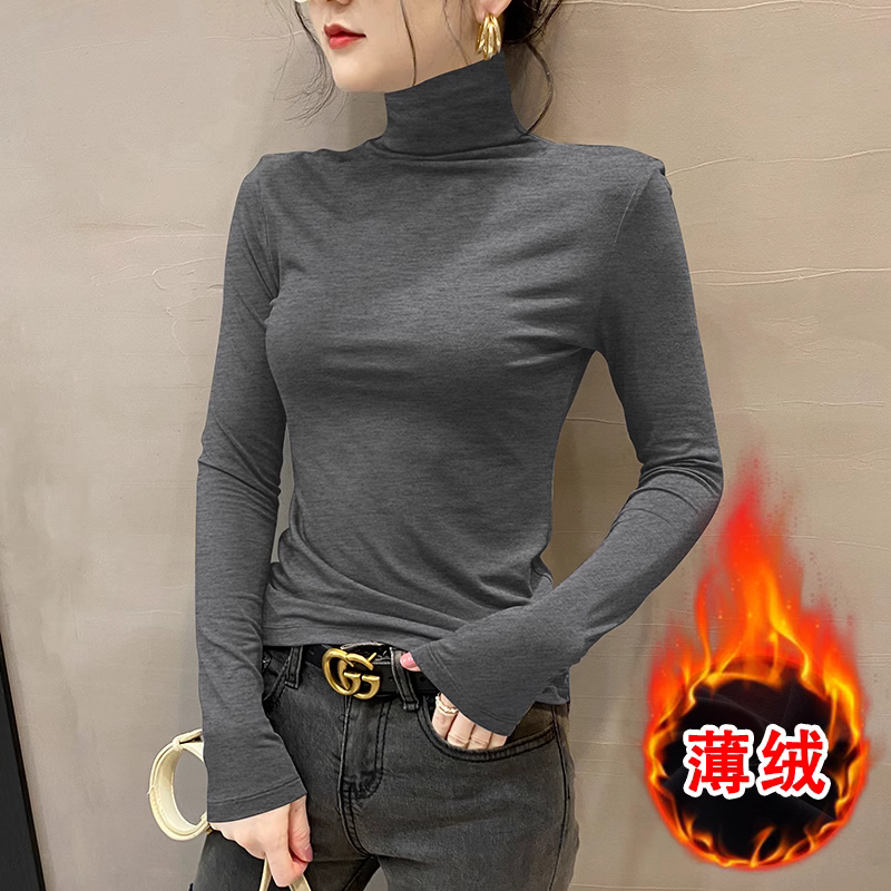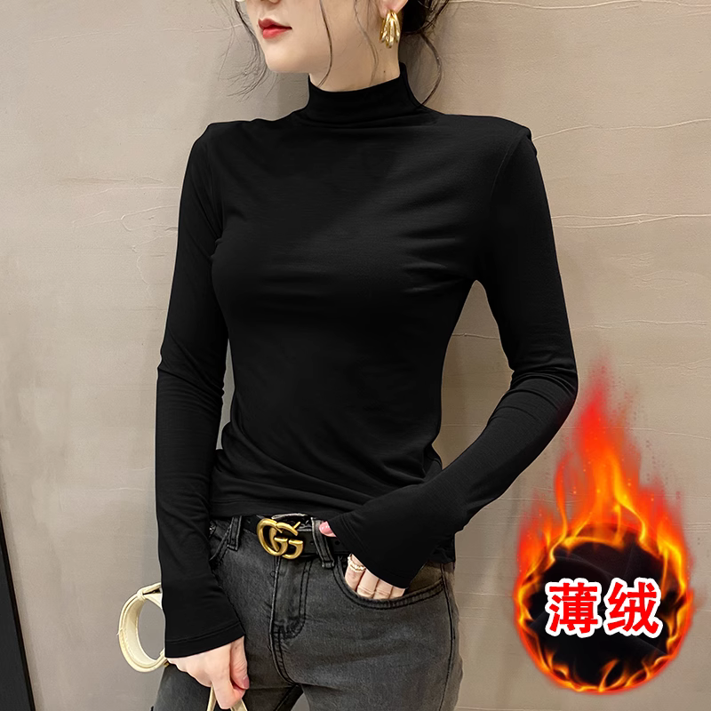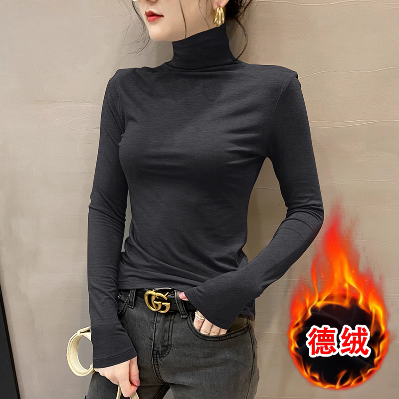 高领双面德绒2024春秋冬打底衫女内搭长袖加绒厚黑色洋气保暖上衣