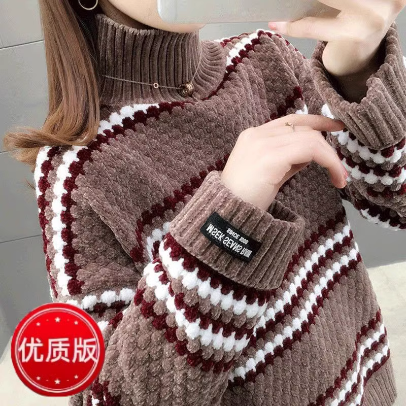 雪尼尔加绒加厚条纹毛衣女宽松内搭秋冬季新款高领套头针织打底衫