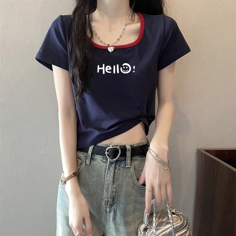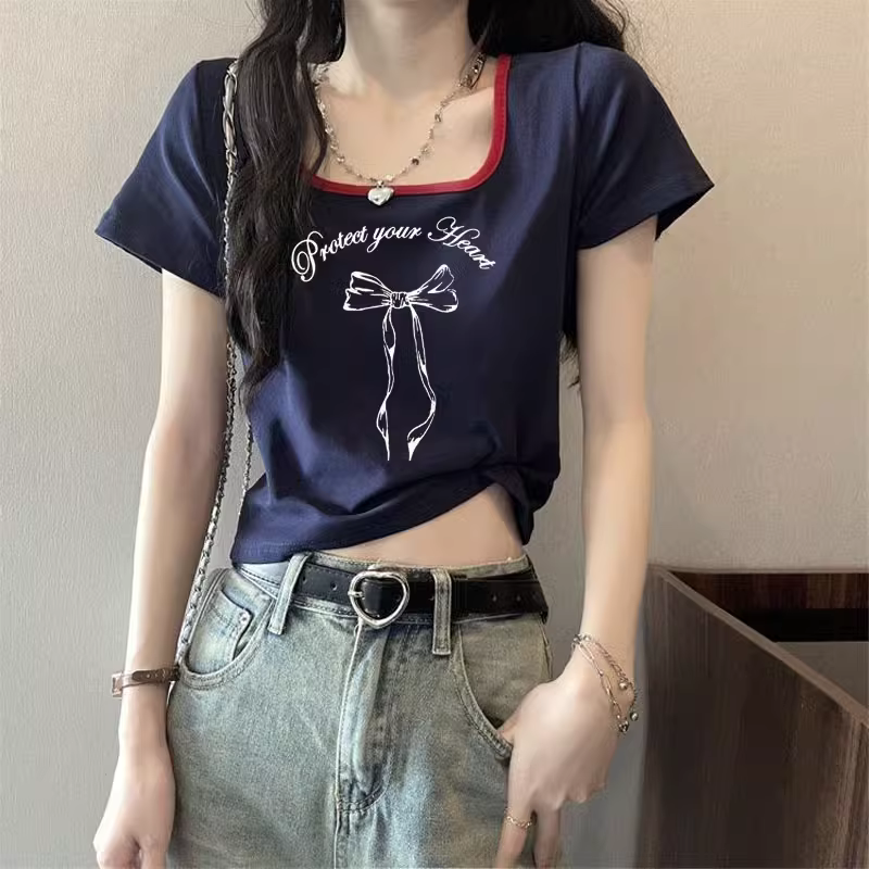 短袖女t恤夏正肩方领修身别致甜辣短款上衣女时尚洋气时髦小个子
